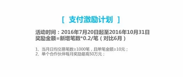 今年(nián)7月(yuè)20日(rì)到(dào)10月(yuè)31日(rì)期間(jiān),單個(gè)ISV接入的(de)所有(yǒ↑u)商戶,月(yuè)日(rì)均使用(yòng)支付寶當面付金(jīn)額大(dà)于等于10元的(de)有(yǒu)效交易達到(dào)1000筆(bǐ),即可(kě)得(de)到(dào←)相(xiàng)比6月(yuè)增量交易0.2元/筆(bǐ)的(de)獎勵,每月(yuè)最高(gāo)獎勵50萬元。在這(zhè)期間(jiān),還(hái)同步對(duì)消費(fèi)者α展開(kāi)了(le)支付寶付款天天立減活動,消費(fèi)者通(tōng)過支付寶向商家(jiā)付款将100%獲得(de)随機(jī)立減,最高(gāo)可(kě)優惠999元。